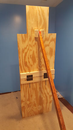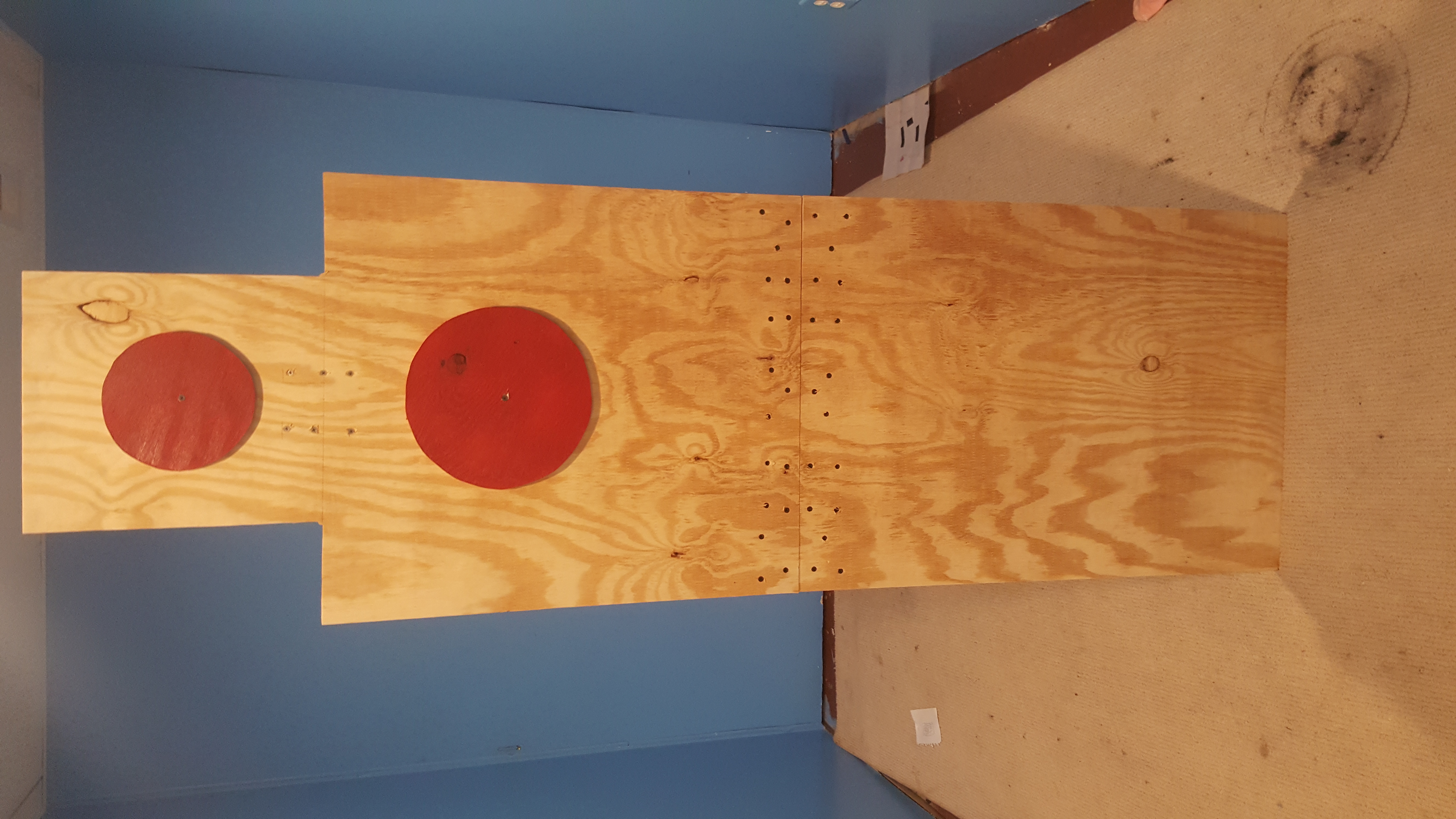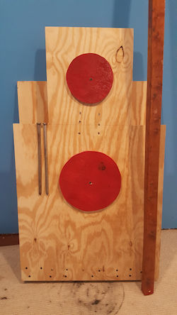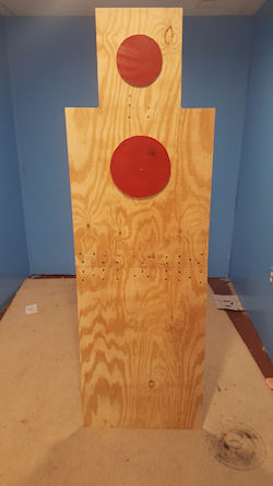 The target may be constructed in any manner available to the marshal, so long as it is very easy to accurately tell where each arrow hit, be that; miss, body, heart, or face. Examples have been produced using PVC pipe and fabric, as well as a basic plywood cut out. It is suggested but not required that the face/heart be a second piece of material in front of the head/body such that an arrow striking it will either make a notably different sound (for example thick foam), or bounce at an odd angle when it hits the edge (for example second piece of plywood). Placing a dog squeaky toy between two pieces of plywood also works well.