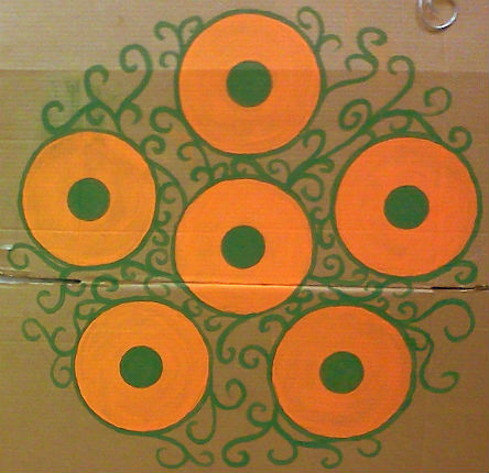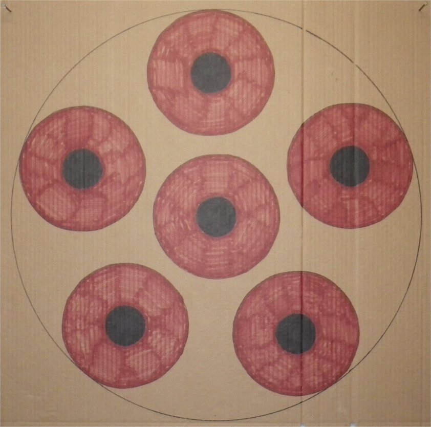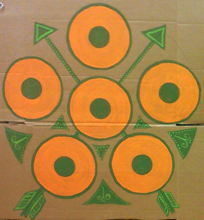 For the SSAC the target consists of six roundels, five in a circle around a central roundel such that it will fit on many standard backstops. Each roundel is 9 inches in diameter with a 3-inch diameter pin or dot in the center. The roundels may be of any colors as long as long as the roundel is of a contrasting color to its background and the pin a contrasting color to the roundel. The first roundel is placed at the top center of the target and the others are placed equidistant from each other within a 30-inch diameter circle. The exact placement with the circle is not critical. The first example below shows the 30 inch circle only for reference in making your target, it is not a required element to shoot, the other two provide sample artwork courtesy of Lady Johanna of An Tir.