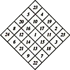 The target face is 20 inches on a side and the small squares are 4 inches square. There are twenty-five squares in total. The target is placed with one corner pointing upward, as per the drawing below. The numbers are placed as shown in the drawing and should be large enough to be read at twenty yards. The lines should also be visible but no wider than 1/4 inch. A printable pdf has been kindly provided by Lord Cameron de Grey of Atlantia.